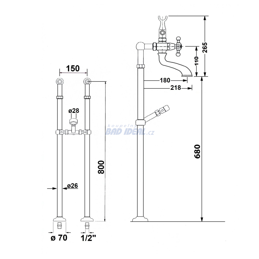Podlahové připojení je určeno k jakékoliv vanové či sprchové baterii s roztečí 150 mm. Má vnitřní 1/2" závity. V podlaze je nutná příprava na klasické 1/2" nástěnky, šroubení (vnitřní závit) nebo přímo vnější 1/2" závity. Tyče jsou otočné a připevní se k podlaze.