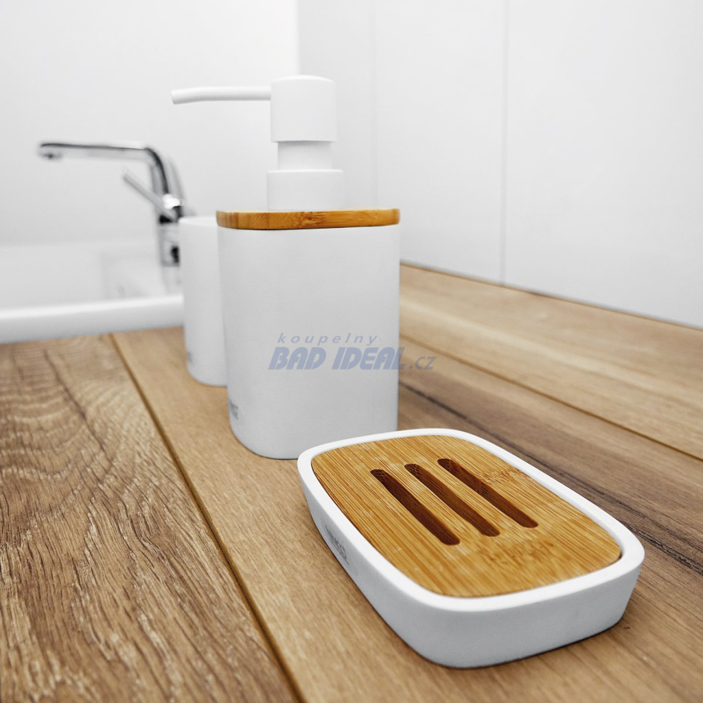 Dávkovač na tekuté mýdlo. Barva bílá. Materiál polyresin, bambusové dřevo. Objem 270 ml. Více informací