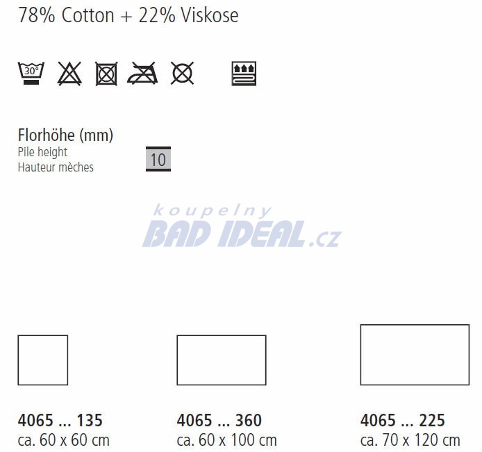 Koupelnové koberce Kleine Wolke z vysoce jakostních vláken jsou vhodné pro praní v pračce i sušení v sušičce. Při šetrném praní s jemným pracím práškem perte odděleně od jiného prádla (součásti soupravy perte dohromady, abyste zamezili vzniku nestejnoměrného vzhledu). Nepoužívejte prosím aviváž, neždímejte ani nenechte schnout na topení. Velké koberce dejte vyčistit do čistírny. Koupelnové koberce pravidelně pořádně vytřepte nebo po nich přejeďte vysavačem se slabým sacím výkonem, aby se vzpřímil flór na povrchu. Lehké pouštění vláken je podmíněno výrobou a je zcela běžné, po prvním oprání ustane. Koberce z bavlny perte s maximálním množstvím vody (případně také v povlaku od polštáře pro zachytávání vláken), po oprání vyčistěte buben i odtokové sítko.