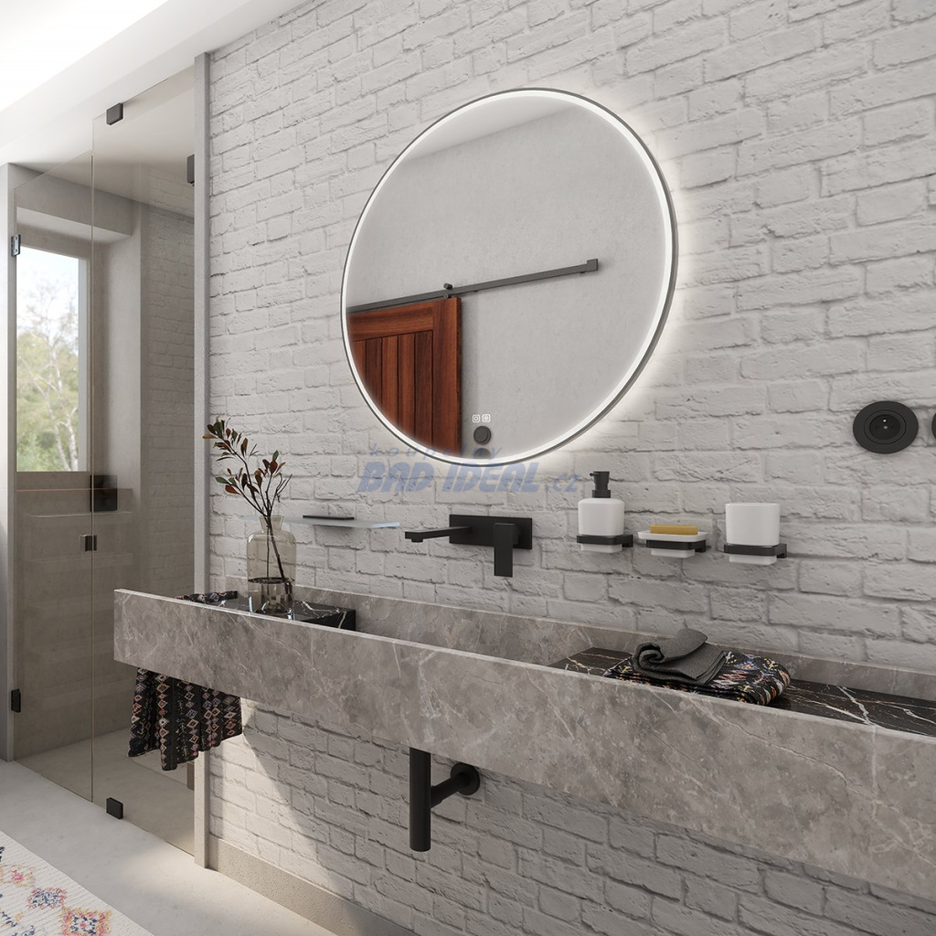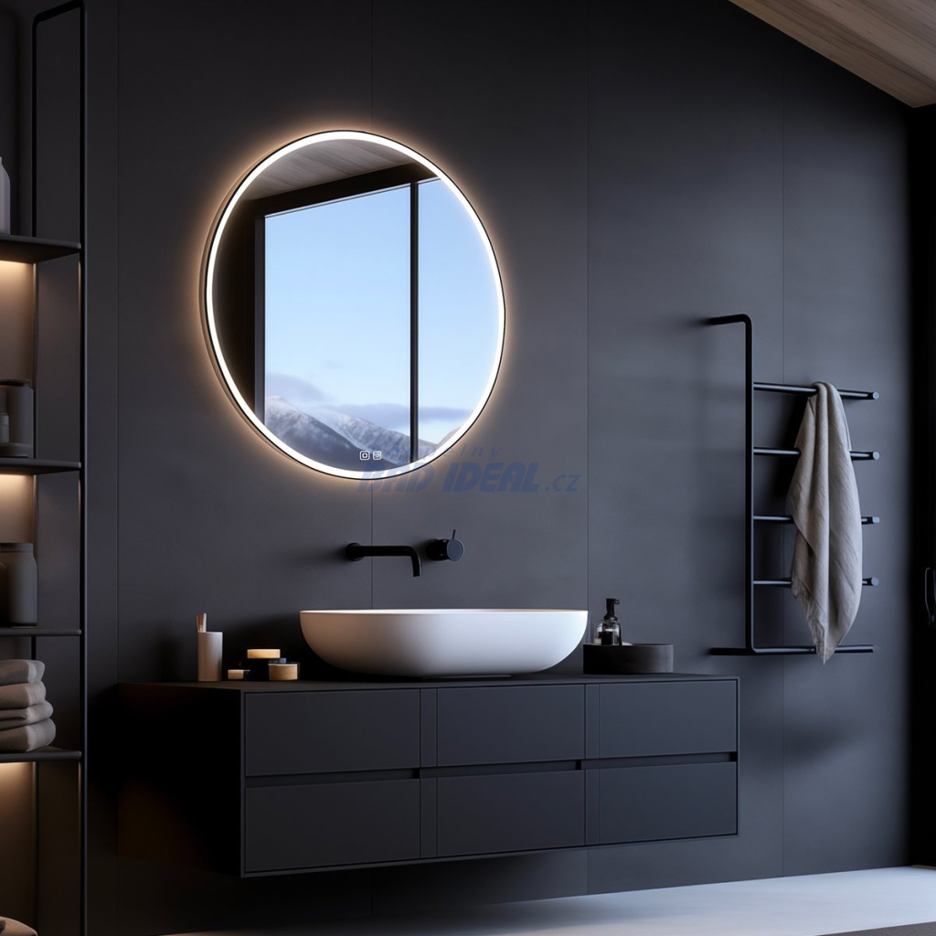 Koupelnové podsvícené KULATÉ LED zrcadlo. Příkon W. Možnost nastavení barevné teploty od 3000 - 6500 K. Možnost nastavení intenzity svítivosti. Lumen.Černé kulaté zrcadlo do koupelny 90 cm s osvětlením, dotykový spínač je skvělým doplňkem do koupelny.