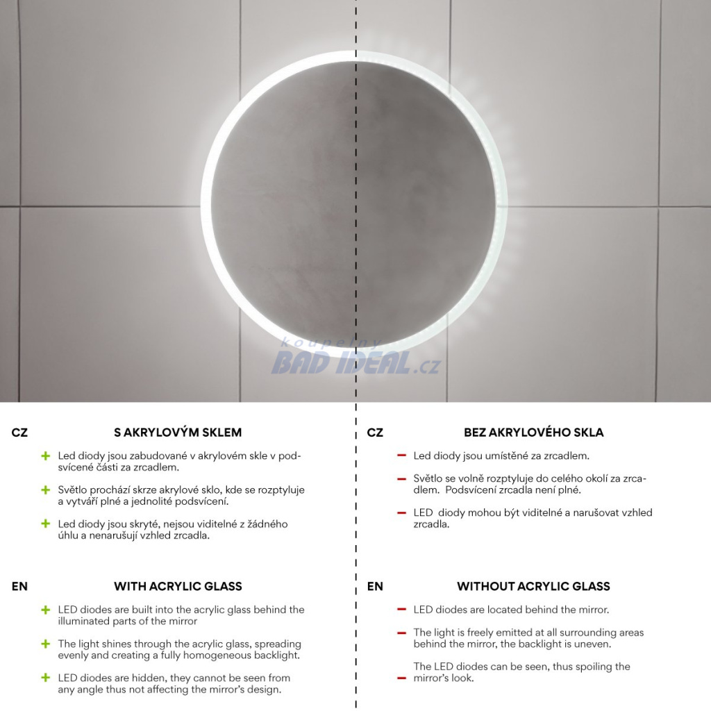 Koupelnové podsvícené KULATÉ LED zrcadlo. Příkon W. Možnost nastavení barevné teploty od 3000 - 6500 K. Možnost nastavení intenzity svítivosti. Lumen. Více informací