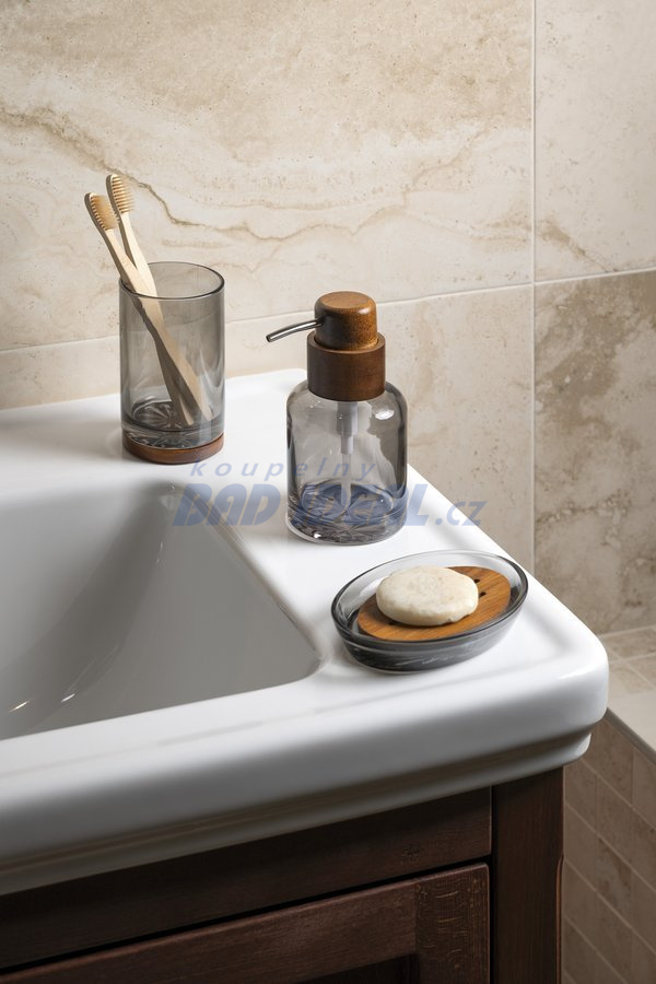 Doplňky z kolekce FIGO se vyznačují kombinací kouřového skla a dřeva, jejichž sladěný design tvoří harmonický celek. Sada obsahuje mýdlenku, sklenku na zubní kartáčky a dávkovač mýdla.