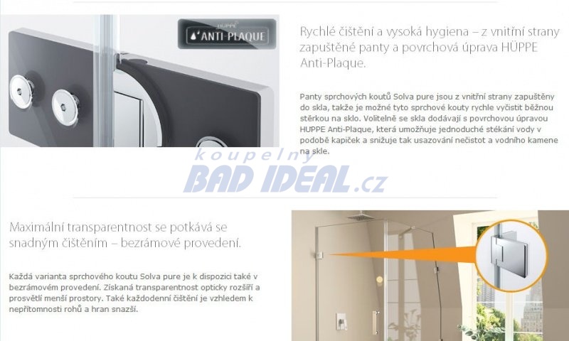 Sklo HÜPPE Anti-Plaque se snadným ošetřováním usnadňuje čištění a voda po něm rychleji stéká. Díky tomu dochází k menšímu usazování nečistot a vodního kamene. Pokud i tak nějaké zbudou, lze je odstranit velmi snadno bez použití agresivních prostředků. Anti-Plaque není povrchová vrstva na skle, nýbrž trvalé zušlechtění povrchu skla.