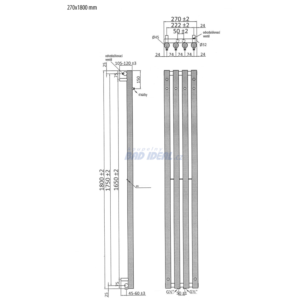 PILON otopné těleso 270x1800mm, se čtyřmi háčky pro ručník, bílá mat.