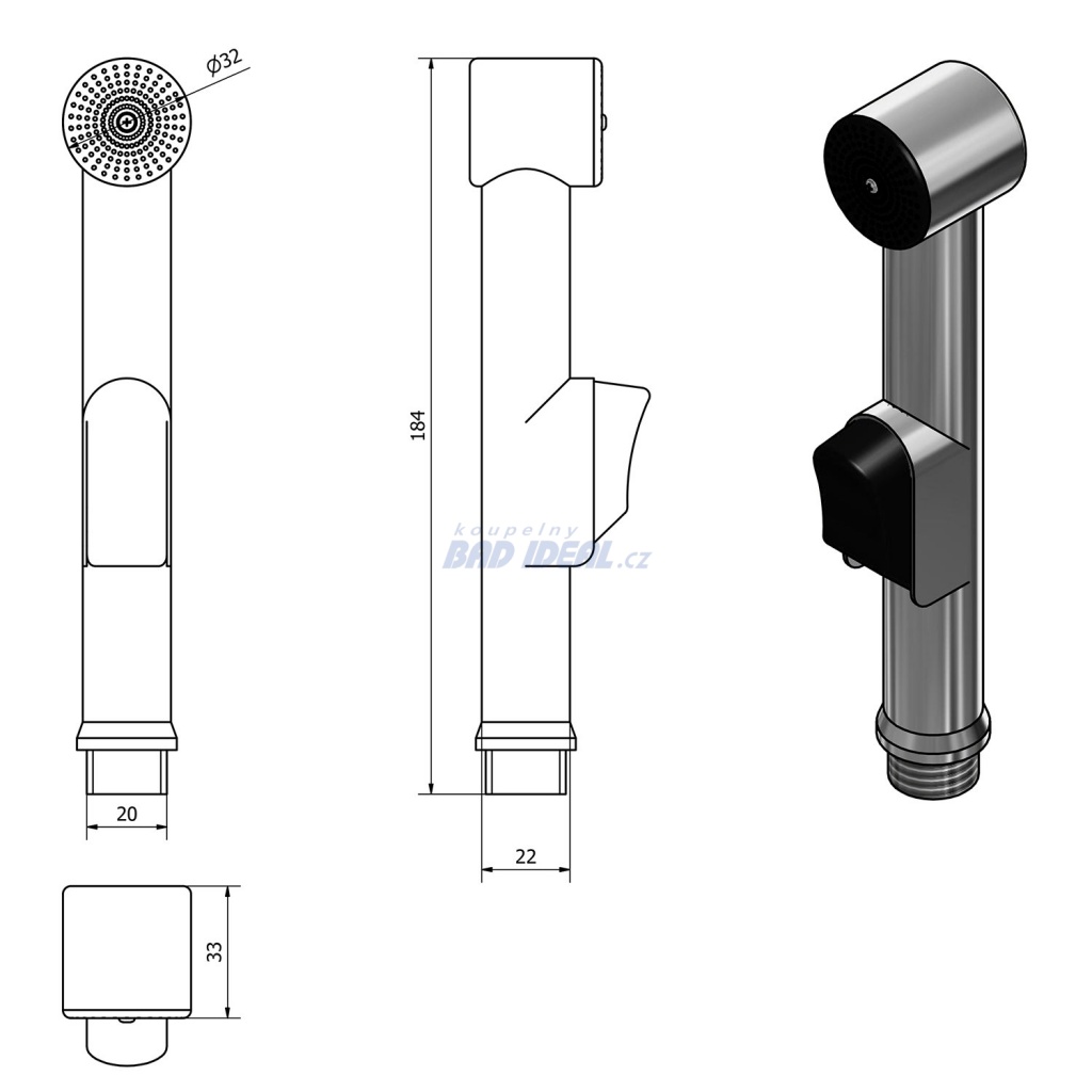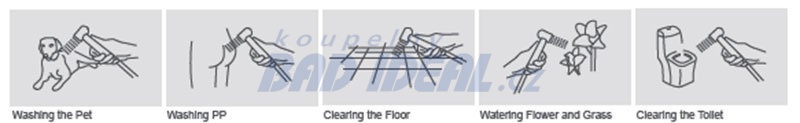 Používání: Voda se zapne standardním spuštěním tahem pákou baterie směrem nahoru. Stisknutím tlačítka na bidetové spršce se přesměruje tok vody do bidetové spršky, nicméně nízký průtok zůstává nadále i přes hubici baterie! Voda se vypne pomocí páky na baterii směrem dolů.