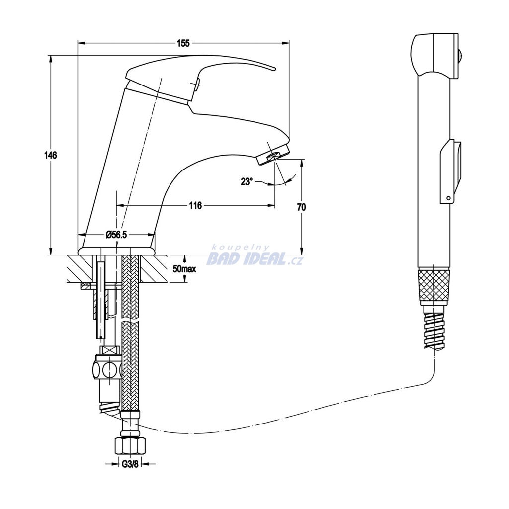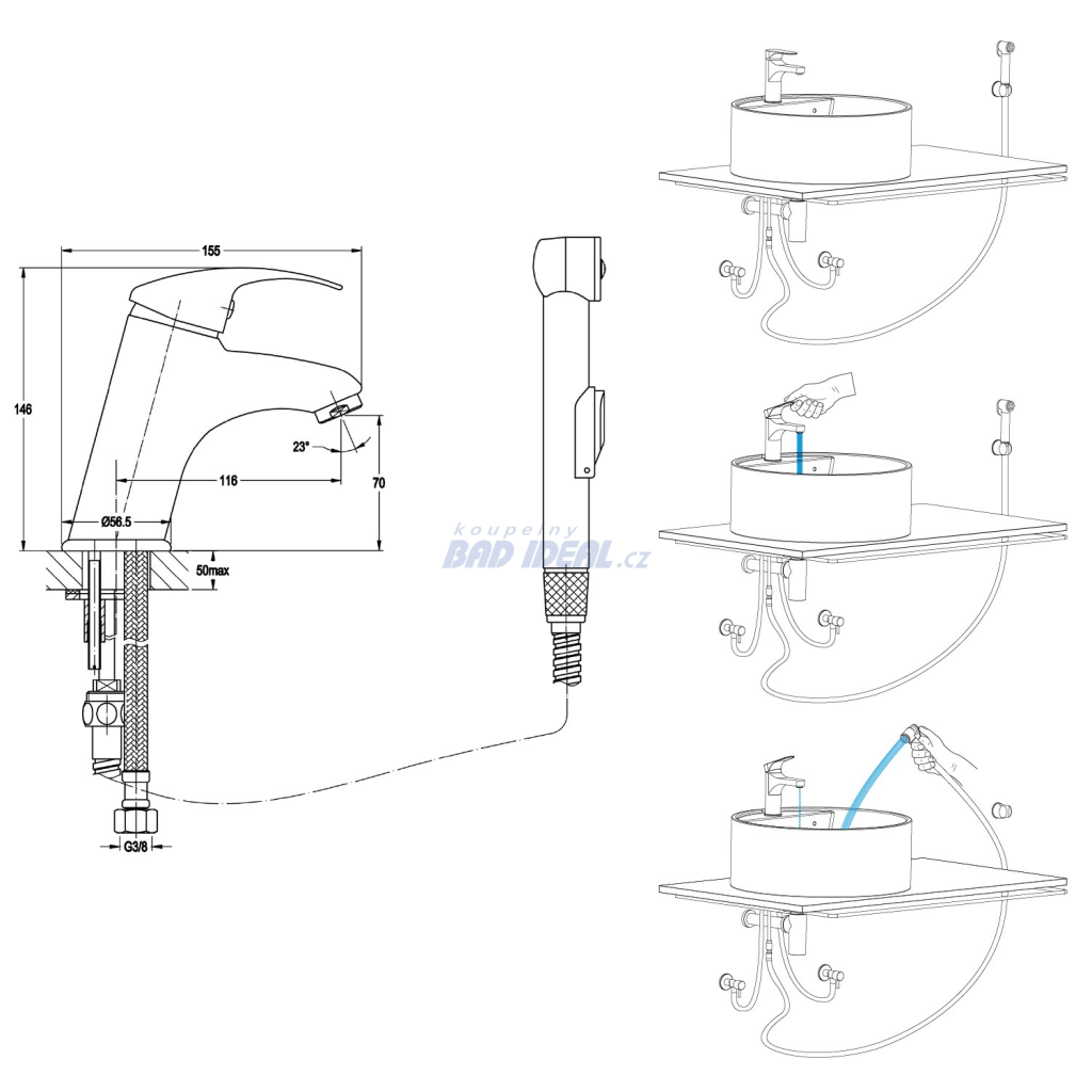 Tip: V případě instalace baterie na umyvadlo se skříňkou lze použít vyústění pro spršku k upevnění na bok skříňky (SG204).