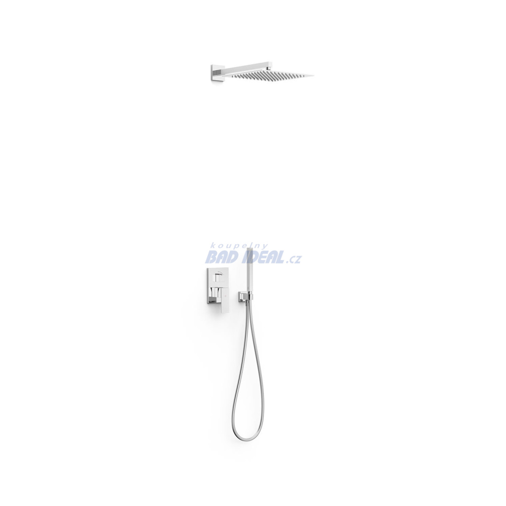CUADRO-TRES Podomítkový jednopákový sprchový set Rapid-Box s uzávěrem a regulací průtoku.· Včetně podomítkového tělesa· Pevná sprcha 300x300 mm s kloubem. Materiál nerez. oceli.· Držák s nástěnným přívodem vody· Ruční sprcha, proti usaz. vod. kamene.· Flexi hadice SATIN. V chromovém provedení. 006.280.04