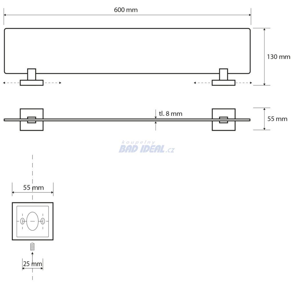 X-SQUARE polička skleněná 600x55x130mm, mléčné sklo, chrom. Vlastnosti Značka SAPHO Série X-SQUARE Rozměr 600x55x130 mm Délka 600 mm Šířka 600 mm Výška 55 mm Hloubka 130 mm Barva Chrom Materiál Mosaz, Sklo Tvar Hranaté Druh… Více informací